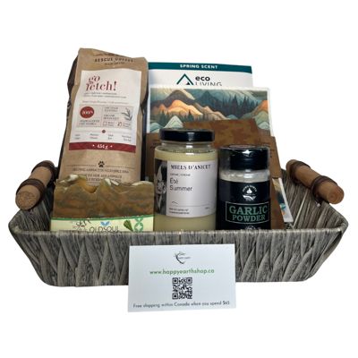 A thoughtful, eco-friendly collection featuring fair trade ground coffee, decadent maple chocolate, Eco-living Club detergent strips, pure raw cream honey, handmade lemongrass verbena soap, aromatic garlic powder, and biodegradable sponge cloths. Perfect for conscious living and everyday indulgence.